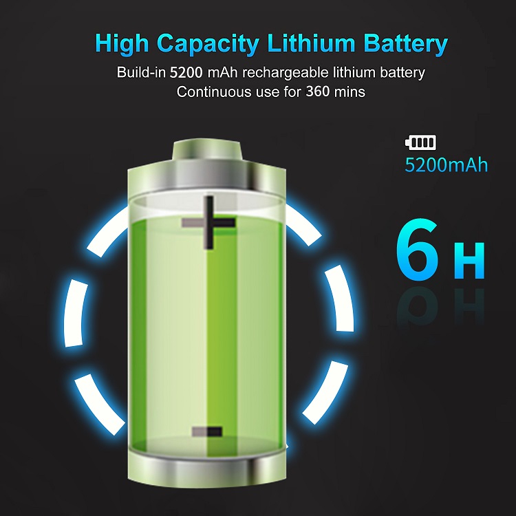 • 5200mAh Rechargeable Battery: -Long-lasting lithium battery supports 3–4 hours of wireless use. Relax anytime, anywhere without restriction.